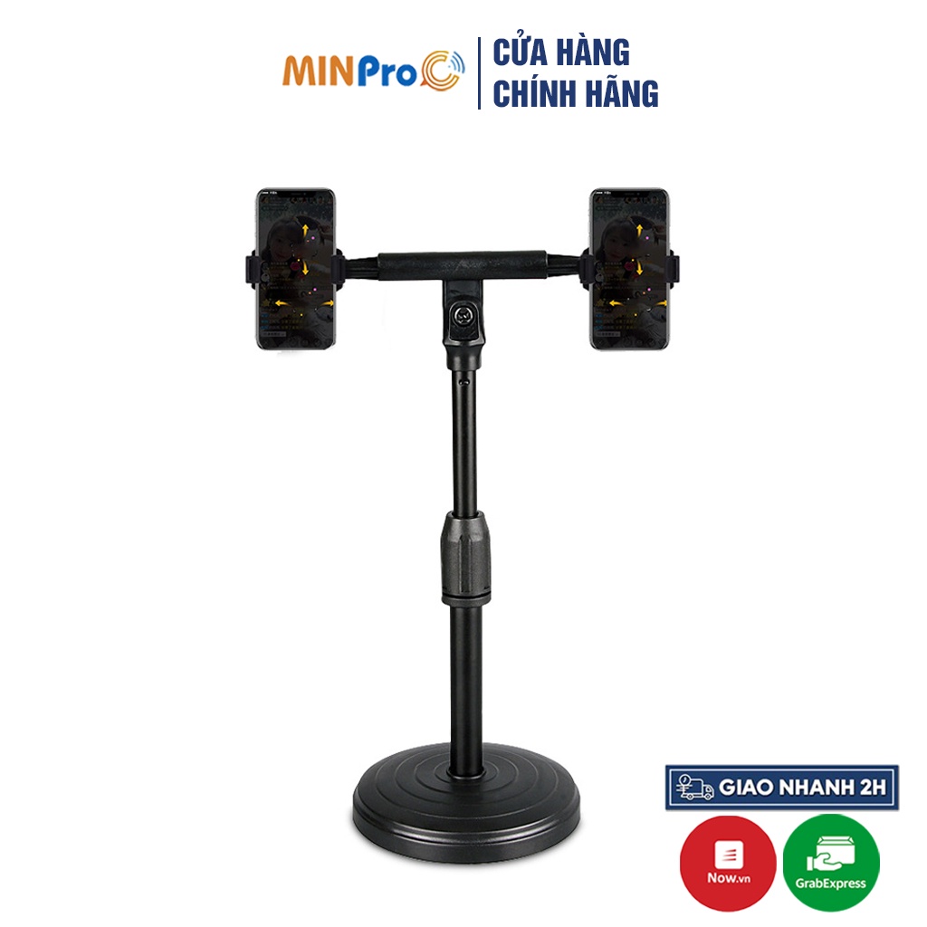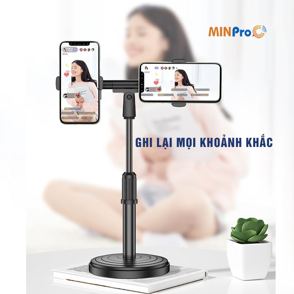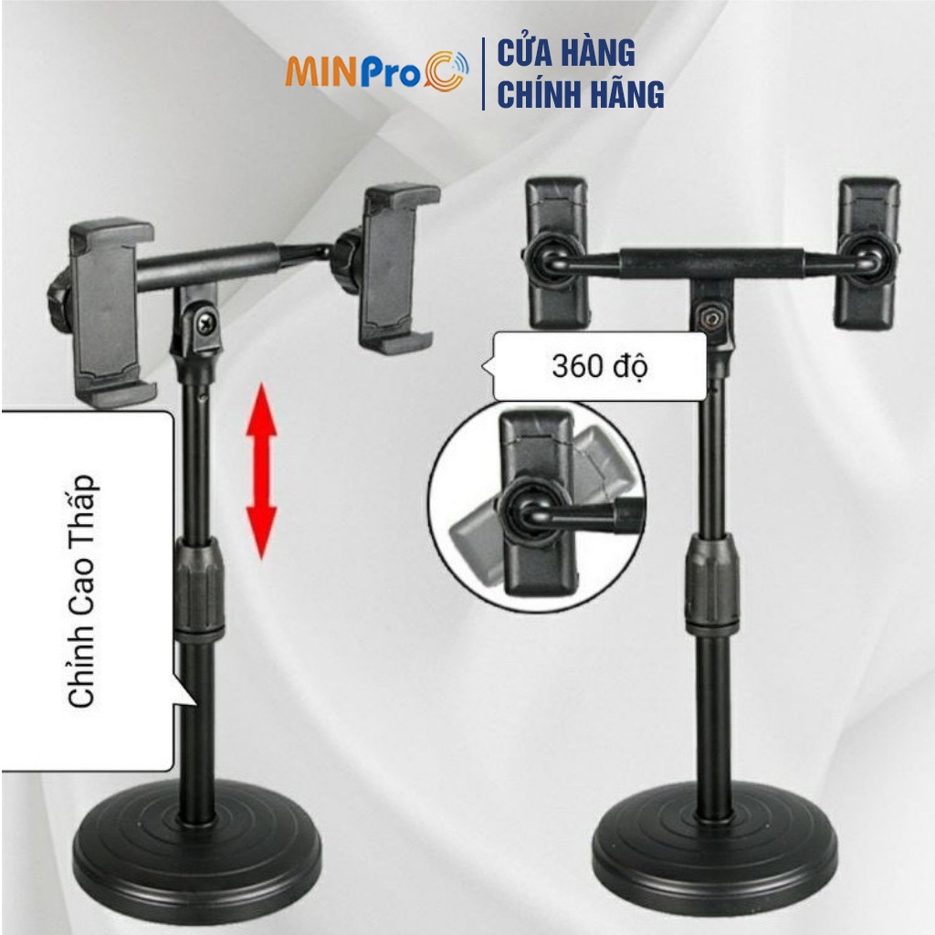 Giới thiệu Giá đỡ điện thoại Microphone Stands 2 kẹp chống lưng 360, đế chân tròn để bàn livestream đa năng, tiện lợi MINPRO