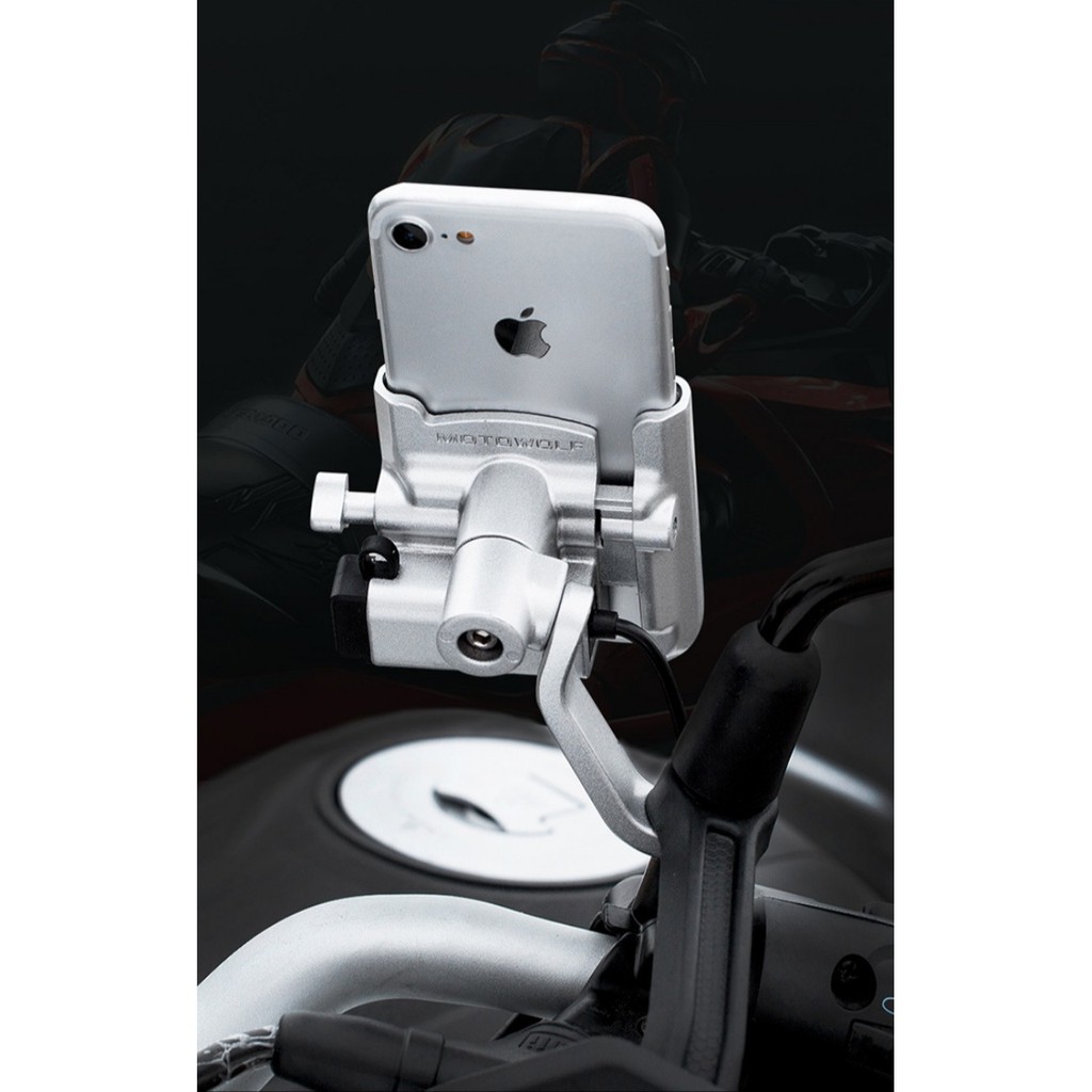 Giá đỡ điện thoại gắn chân kính tích hợp cổng sạc motowolf dùng để điện thoại làm bản đồ dẫn đường hoặc dùng quay camera hành trình. Phần khung gắn tương thích hầu hết tất cả điện thoại từ 3.5 inch đến trên 6 inch, bên hông của phần khung kẹp điện thoại có lót mút đệm không gây trầy sướt điện thoại Phần thân giá đỡ cnc motowolf có khả năng xoay 360 độ tùy chỉnh.