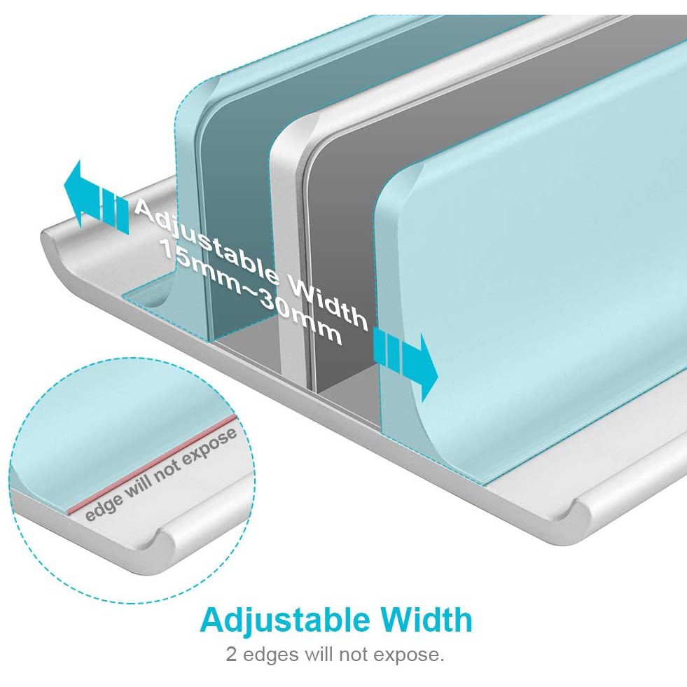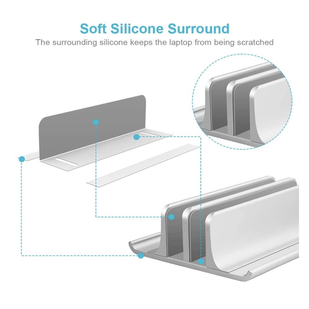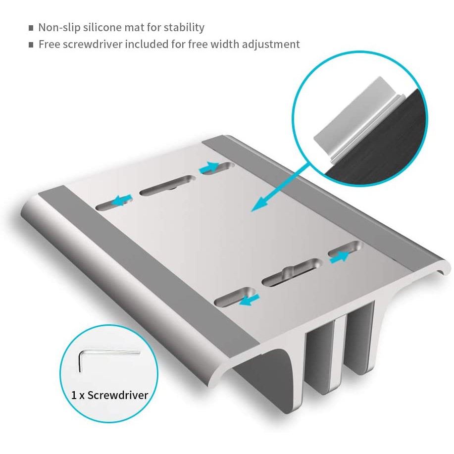 -Bề mặt cong 3D, ba mặt lót Silicon chống trầy xước hiệu quả. Silicone được dán ở phía dưới để cố định và ổn định giá đỡ. Vít ở phía dưới có thể trượt để điều chỉnh phù hợp nhiều loại laptop.