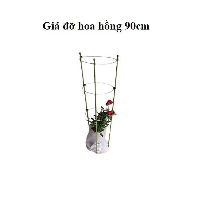 Giá đỡ hoa hồng, hoa leo đa năng kích thước cao 90cm gồm:- 3 chân đứng lỏi thép bọc nhưa cao cấp phi 7 cao 90 cm