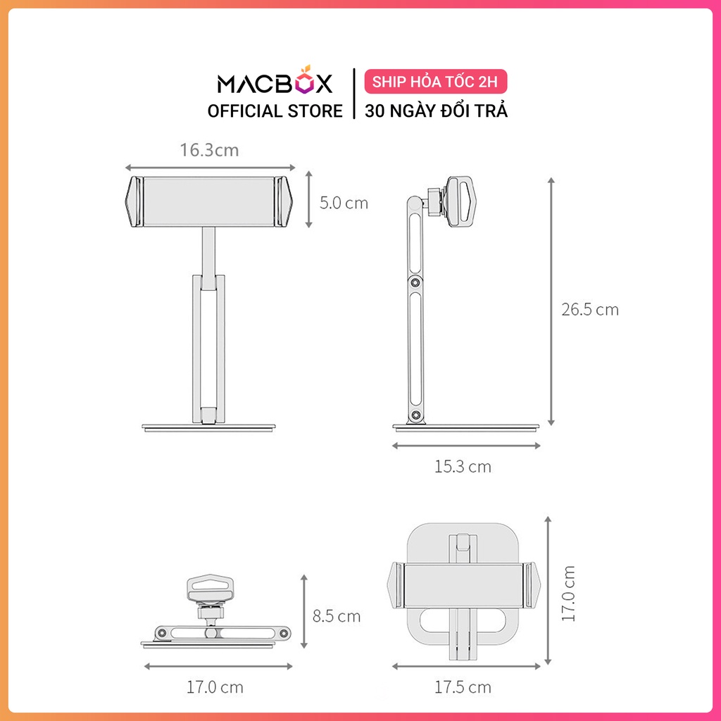 ✔️Chất liệu chính: Hợp kim nhôm tại phần thân và đế, phần kẹp thiết bị bằng nhựa + đệm silicon