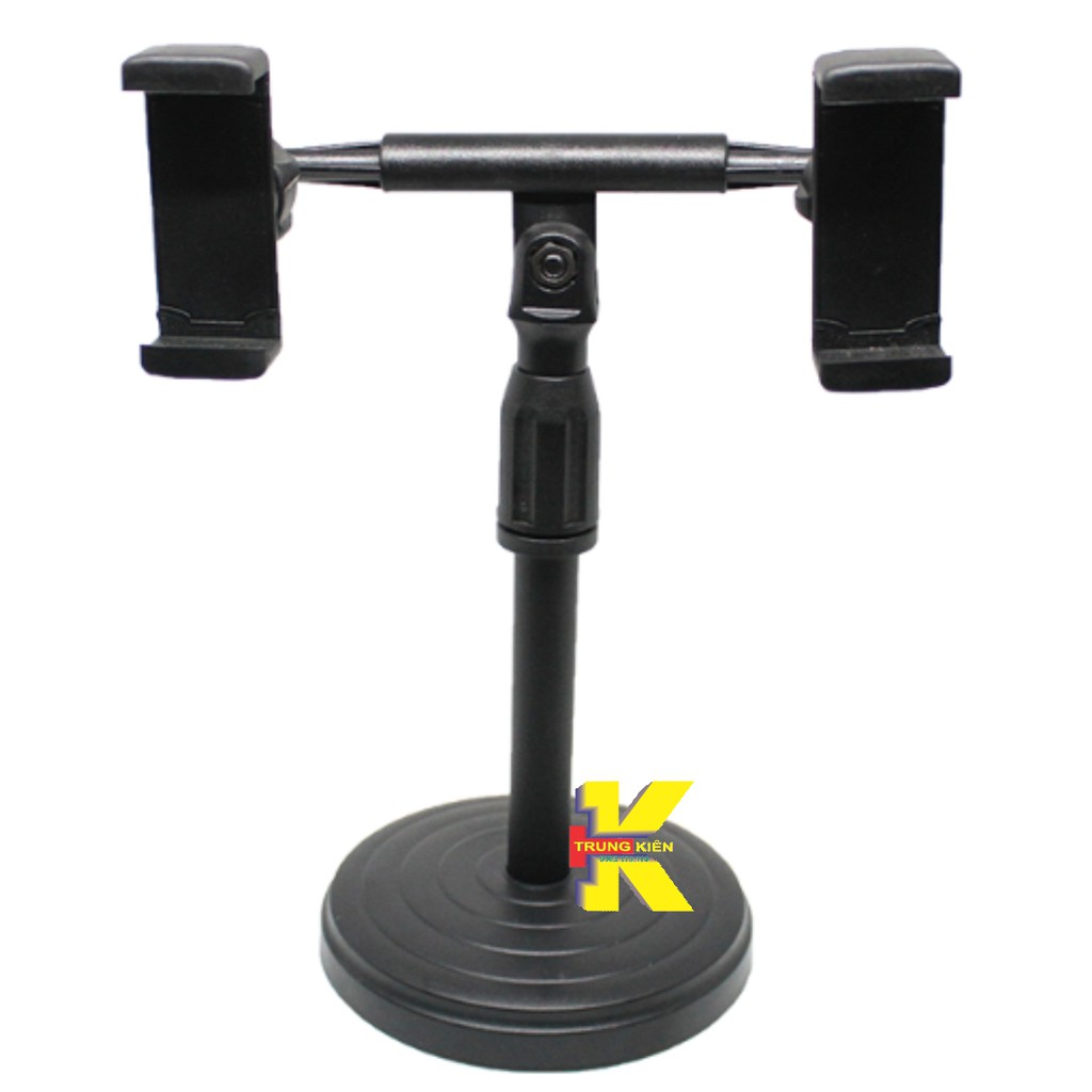 Giá đỡ kẹp 2 điện thoại dùng cho quay video, livestream...Chất liệu hợp kim chắc chắn.Phù hợp gắn các máy từ 4 – 6 inch, giá đỡ Live kéo dài đế tròn.Gíá đỡ live chữ T có thể kéo dài ra được thiết kế với đế tròn gọn nhẹ nhưng khá chắc chắn thuận tiện cho việc di chuyển mà mang theo bên mình. Xuất Xứ: Trung Quốc.