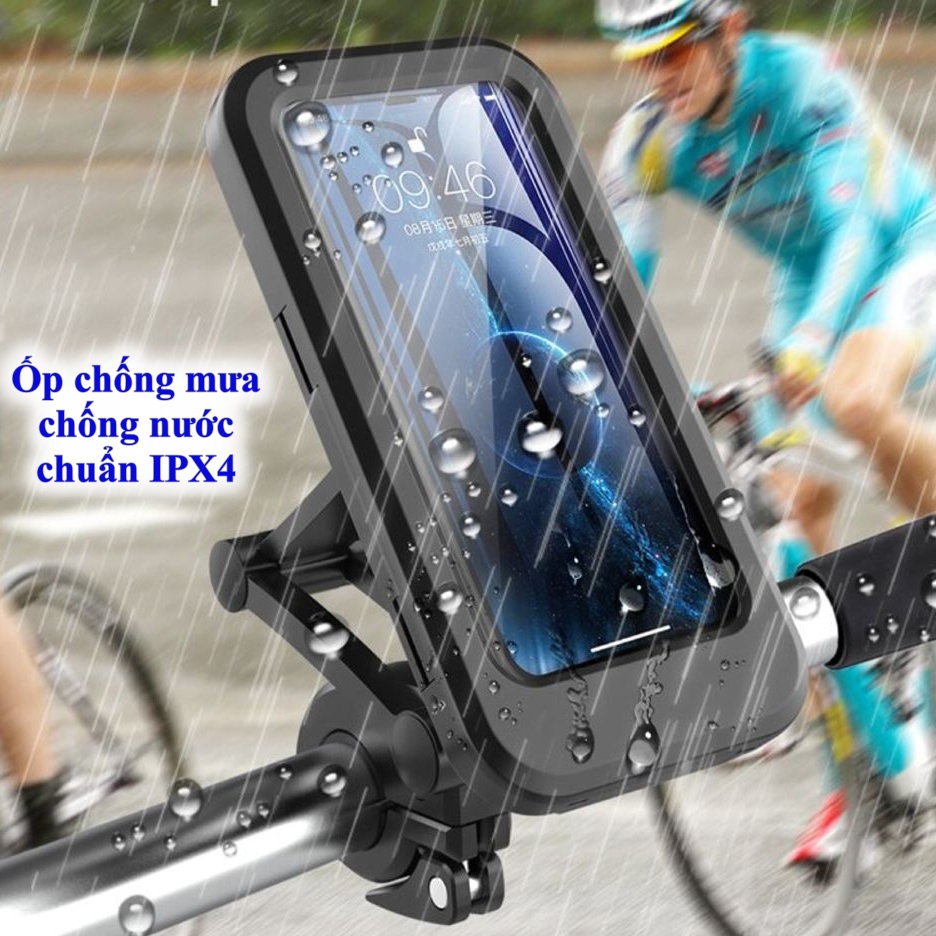 Giá đỡ kẹp điện thoại loại lớn kèm ốp chống mưa chống nước chuẩn IPX4 kẹp vào ghi đông kẹp gắn kính chiếu xe đạp, xe máy