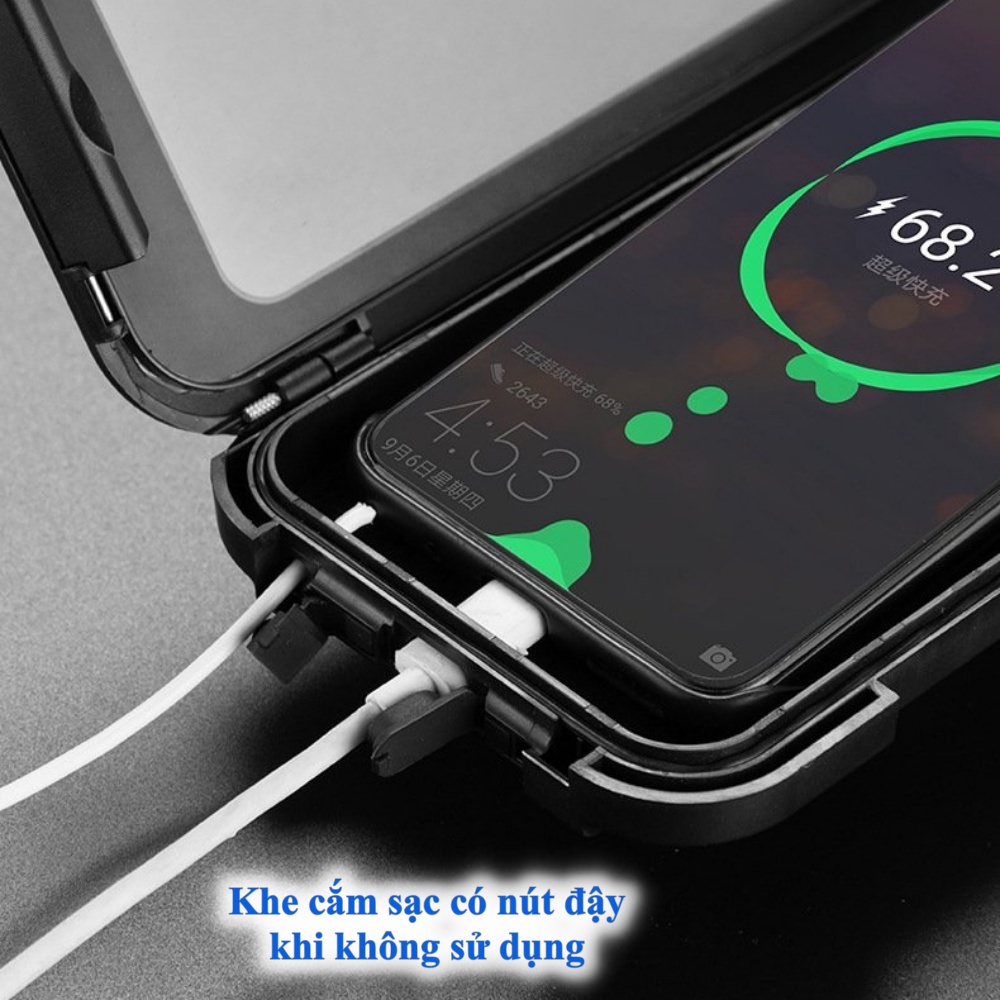 Giá đỡ được làm bằng chất liệu nhựa ABS chắc chắn kèm phần ốp lớn bọc toàn bộ điện thoại, có ron kín chống mưa, chống thấm nước hiệu quả đạt chuẩn IPX4 (không ngâm trong nước).