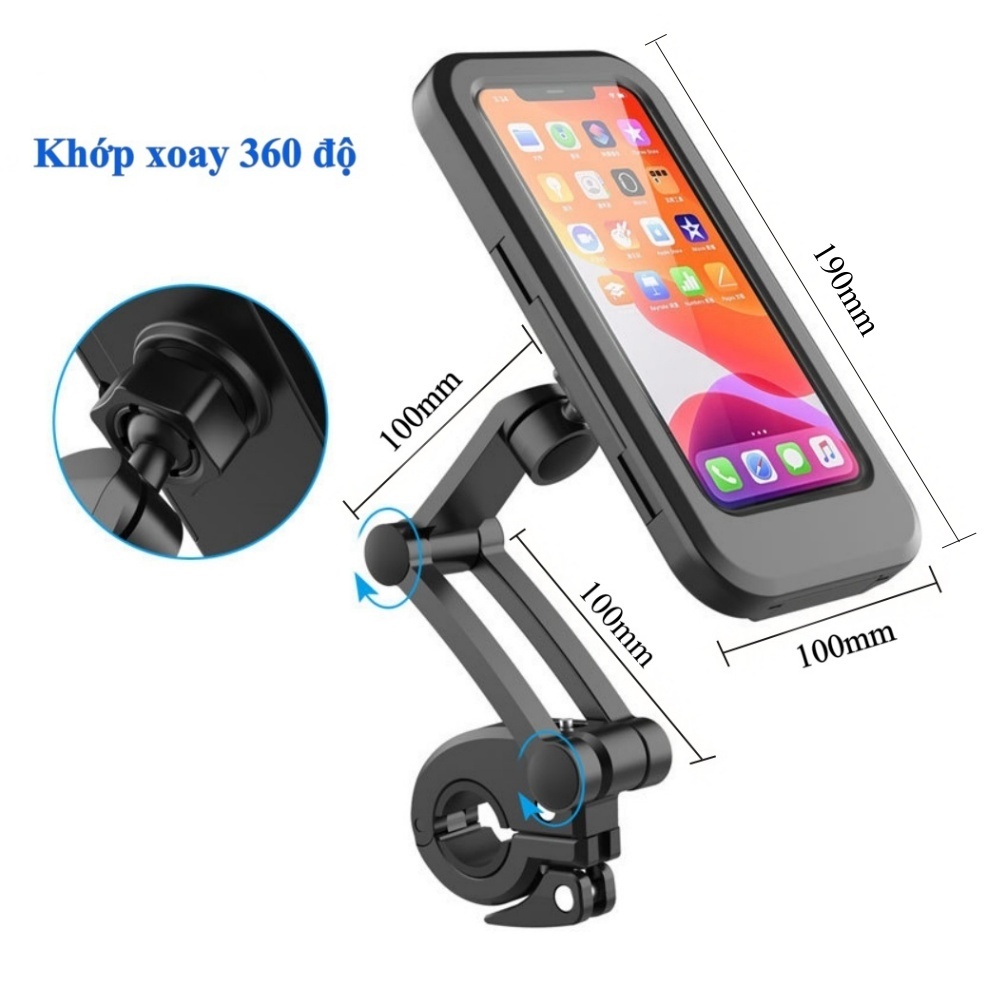 Giá đỡ kẹp điện thoại loại lớn kèm ốp chống mưa chống nước chuẩn IPX4 kẹp vào ghi đông xe đạp, kẹp gắn kính chiếu hậu xe máy xoay ngang dọc tay đỡ loại dài💥 MÔ TẢ SẢN PHẨM