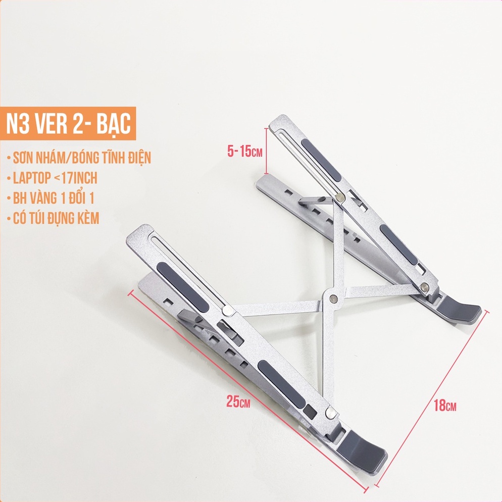 1️⃣Mẫu N3 Ver 1 là mẫu giá đỡ ra đời đầu tiên, thiết kế làm nên thương hiệu giá đỡ laptop, chất liệu nhôm, được anode bạc nên sáng bóng. Tuy nhiên chất liệu sơn này không quá bền, kích thước hơi nhỏ hơn sau với đời sau nên phù hợp với laptop tầm 14 inch