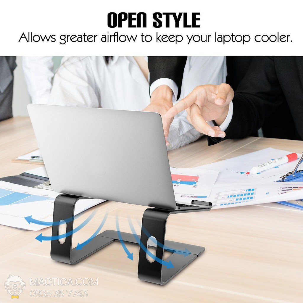 - Thiết kế tản nhiệt: Thân giá đỡ làm bằng chất liệu nhôm có chức năng thu nhiệt, giúp giảm nhiệt độ laptop một cách tự nhiên. Góc nghiêng về phía trước và thiết kế kiểu mở cung cấp nhiều không gian hơn cho luồng không khí để giữ cho thiết bị của bạn mát mẻ.