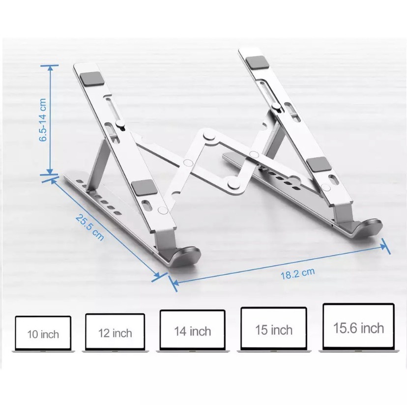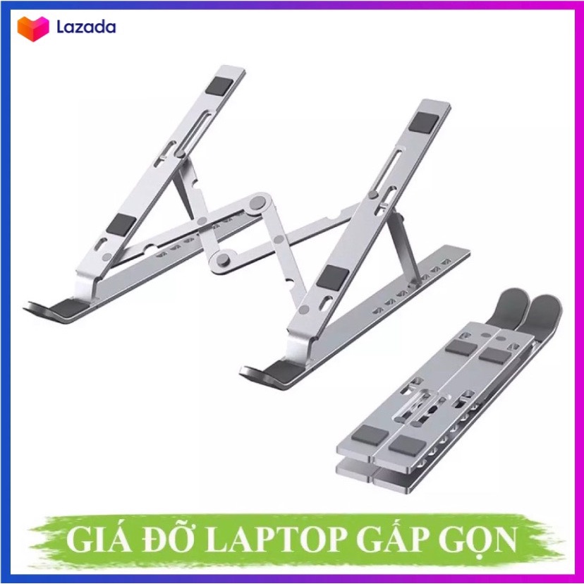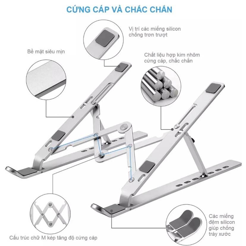 Gía đỡ laptop hợp kim nhôm dành cho Laptop, Ipad, Surface, Macbook... Có thể gấp gọn tiện lợi khi mang theo thường xuyên Dễ dàng điều chỉnh độ cao với 7 nấ c chỉnh linh hoạt, Phù hợp laptop từ 11 ~ 17" Hỗ trợ tản nhiệt hiệu quả Đệm silicone chống trơn trượt.