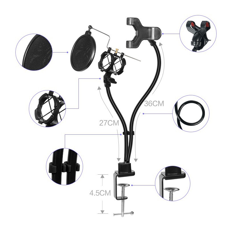- Đầu đỡ mic bằng hợp kim chống gỉ, tay cầm chắc chắn, dây cắm có chốt- Giá treo kim loại kẹp bàn bền đẹp xoay nhiều tư thế