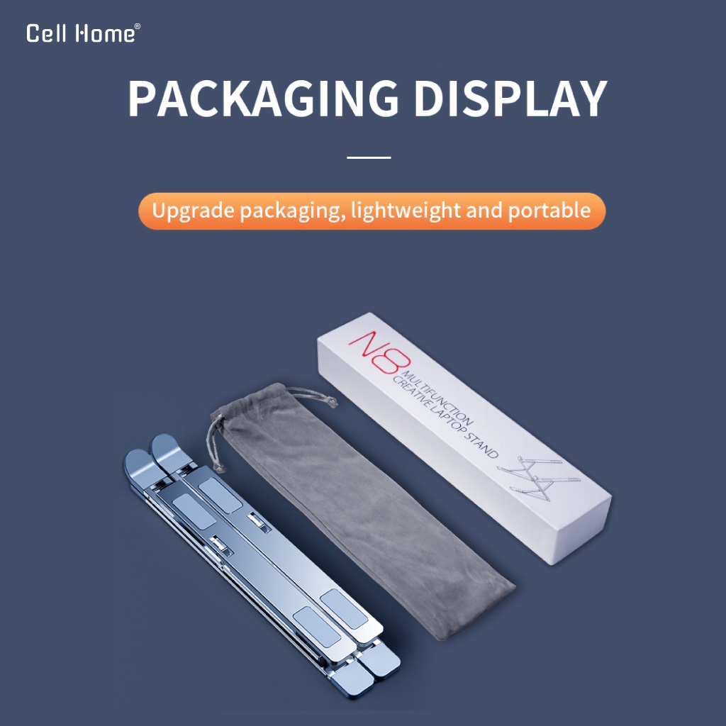 - Giá đỡ Laptop nhôm có thể gập gọn mang theo hằng ngày rất tiện dụng, sau khi gấp gọn kích thước chỉ ngang 1 chiếc quạt giấy, và được trang bị túi đựng bằng vải nhung kèm theo rất tiện lợi.