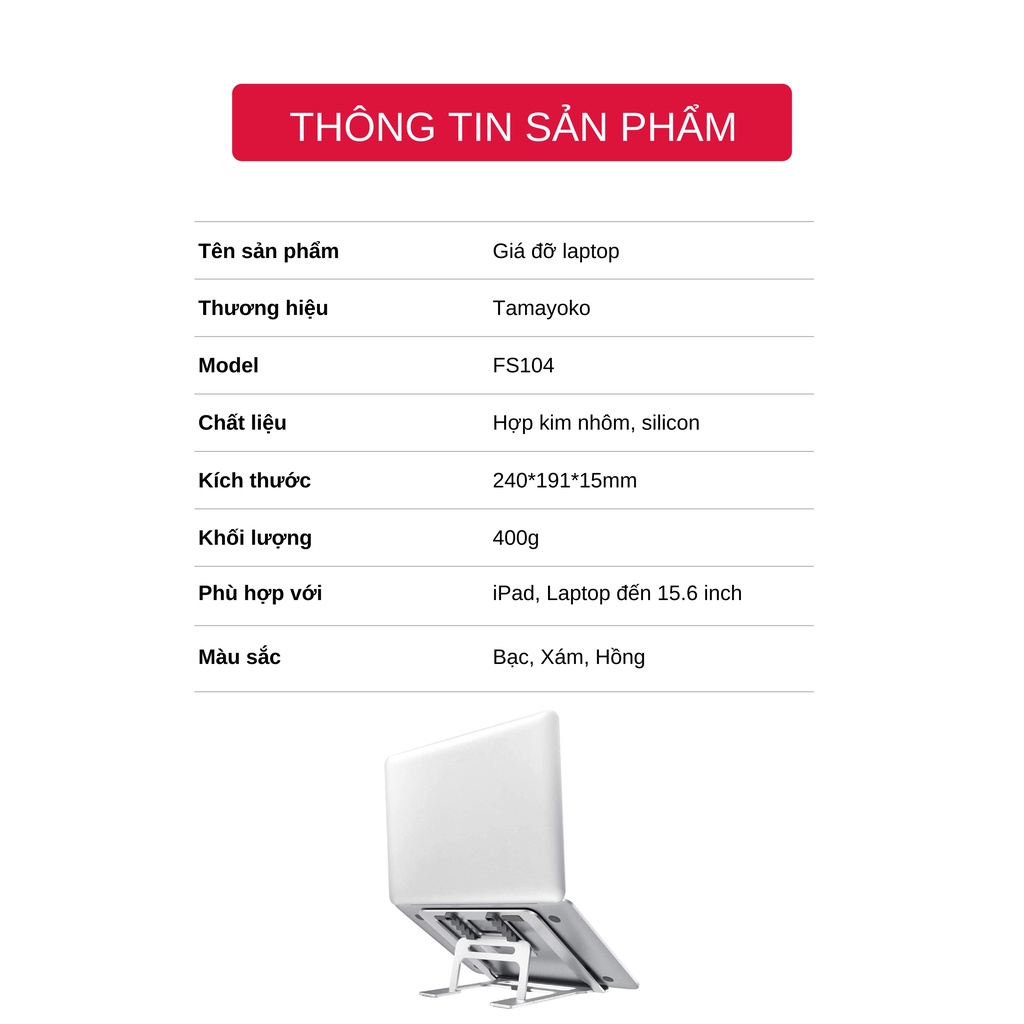 Giới thiệu Giá Đỡ Máy Tính, Laptop, iPad, Macbook Hợp Kim Nhôm Cao Cấp. Hỗ Trợ Tản Nhiệt Chống Mỏi Cổ, Vai, Gáy Tamayoko FS-104