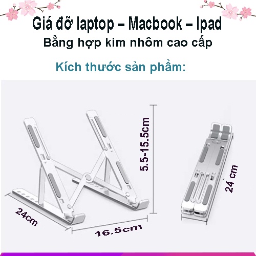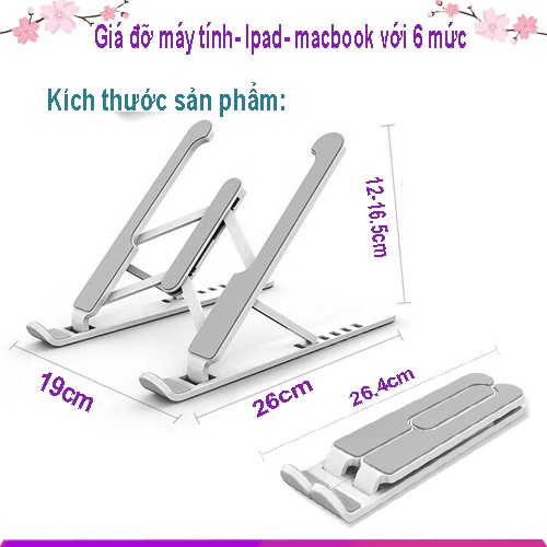 - Ngoài ra shop còn có giá đỡ laptop, macbook bằng nhựa ABS cao cấp, với 6 cấp độ nâng lên hạ xuống và có thể gập gọn mang theo hàng ngày rất tiện dụng, sau khi gấp gọn kịch thước chỉ ngang 1 chiếc quạt giấy, siêu nhẹ, siêu bền, mẫu mã rất đẹp