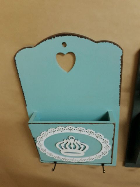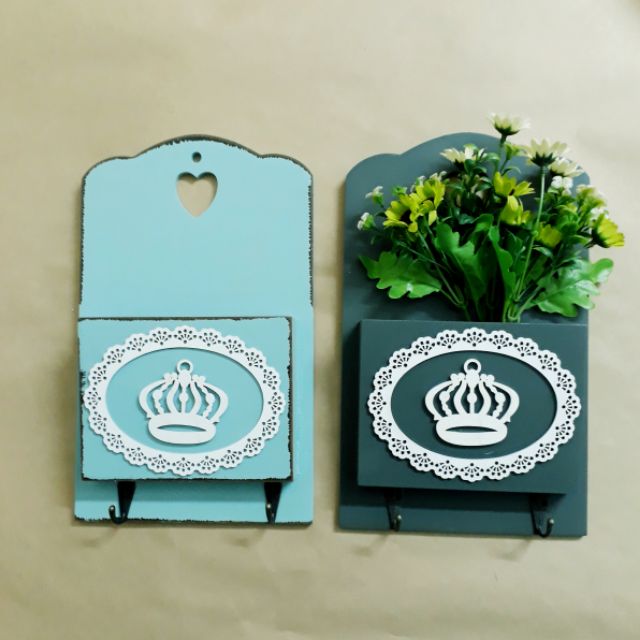 Giá gỗ để đồ kèm 2 móc treo với họa tiết trang trí hình vương miện phong cách retro.Sản phẩm vừa là đồ trang trí phòng, vừa để đồ dùng như điều khiển, chìa khóa...