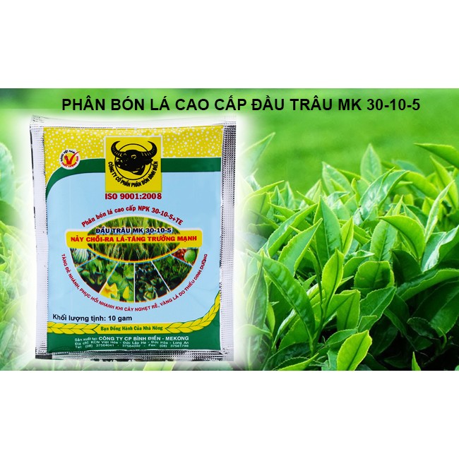 - Phân bón lá cao cấp Đầu Trâu MK 30-10-5 10g phù hợp dùng cho lúa, các loại cây cảnh, cây hoa và nhiều loại cây trồng khác.