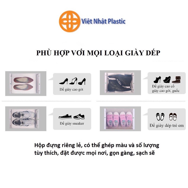Hộp Đựng Giầy Cao Cấp Hàng Việt Nhật Nhựa Cứng,Nguyên Khối, Gấp Gọn Và Xếp Chồng Tiện LợiNếu bạn luôn đau đầu vì chỗ để giày luôn lộn xộn, gây mùi khó chịu thì hộp đựng giày việt nhật sẽ là một giải pháp ưu việt cho không gian nhà của bạn.