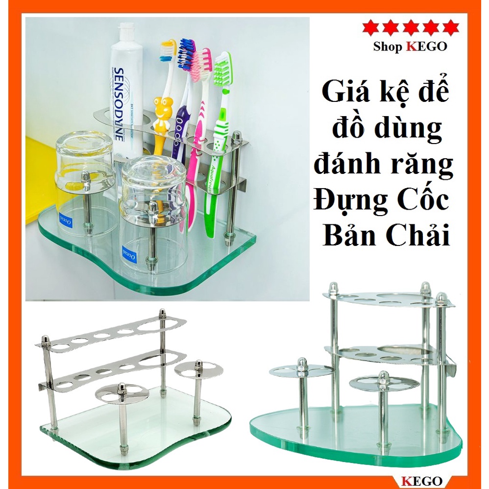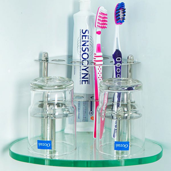 Kệ để được 1 tuýp kem đánh răng và 4 cây bàn chải đánh răng và 2 ly thủy tinh