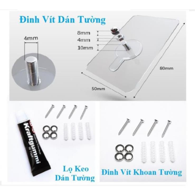 - Bộ sàn phẩm gồm 01 Kệ INOX + 4 miếng dán tường pvc + 1 chai keo+ 2 móc inox + 1 bộ vít khoan tường