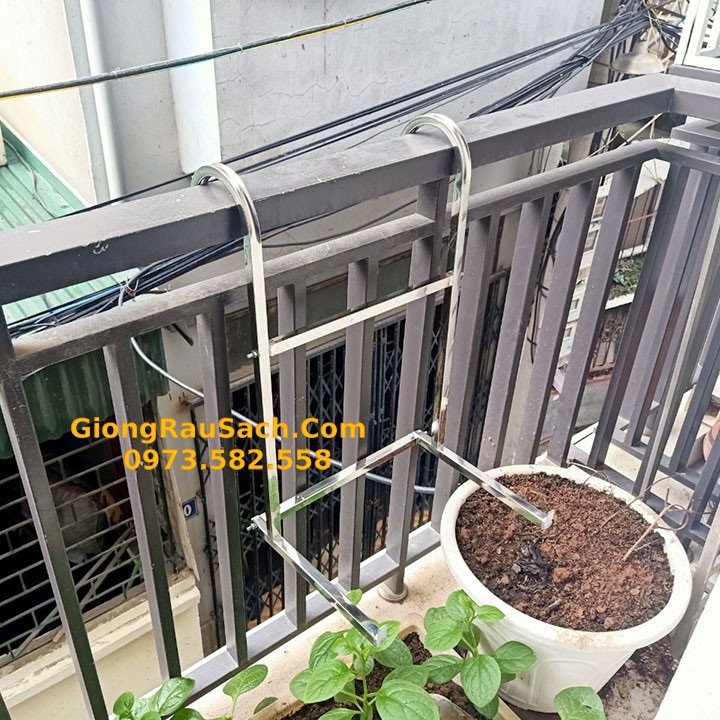 Giá móc treo chậu cây cảnh tại ban công chung cư được làm bằng Inox, giá treo không bị gỉ, luôn sáng bóng đẹp.