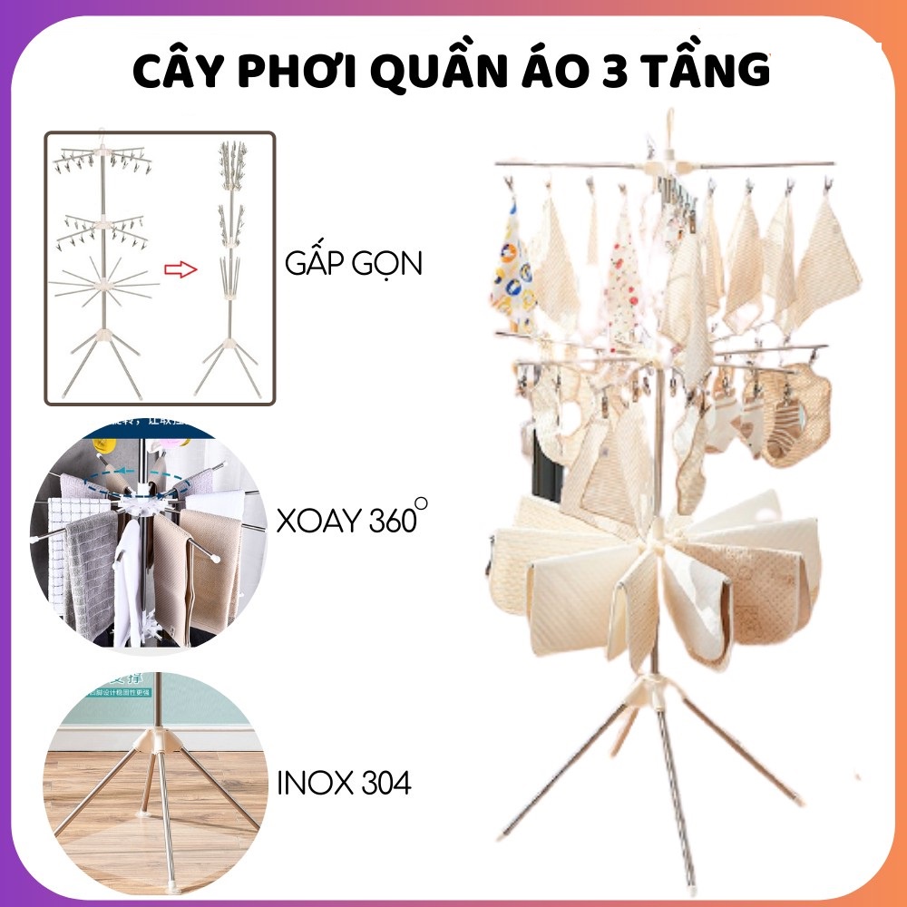 ☀️ Cây phơi quần áo 3 tầng với 3 giá phơi đồ cực kì chắc chắn và tiện dụng, có thể gập gọn khi không sử dụng, móc trùm có thể tháo rời làm 1 móc treo khác