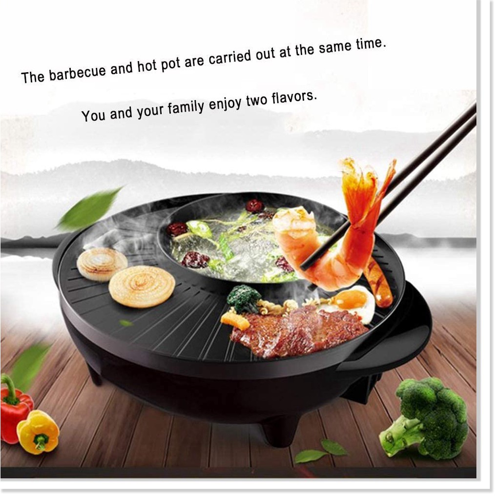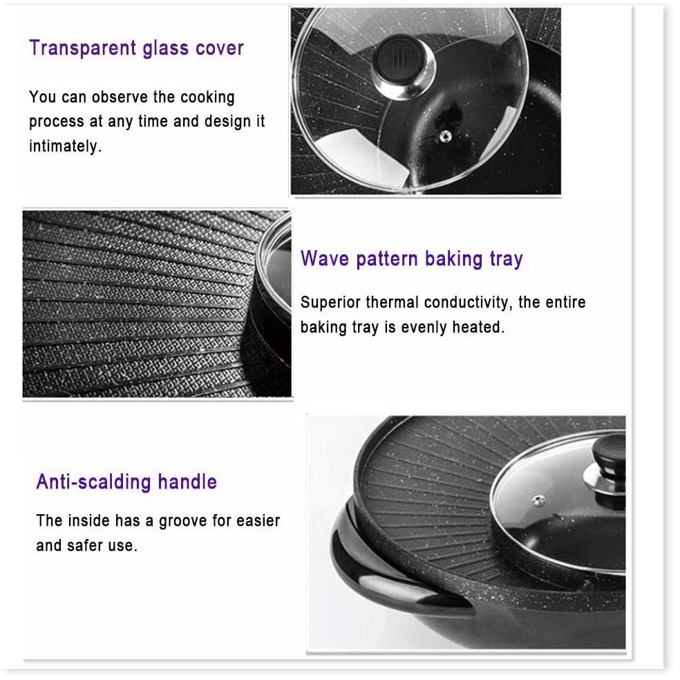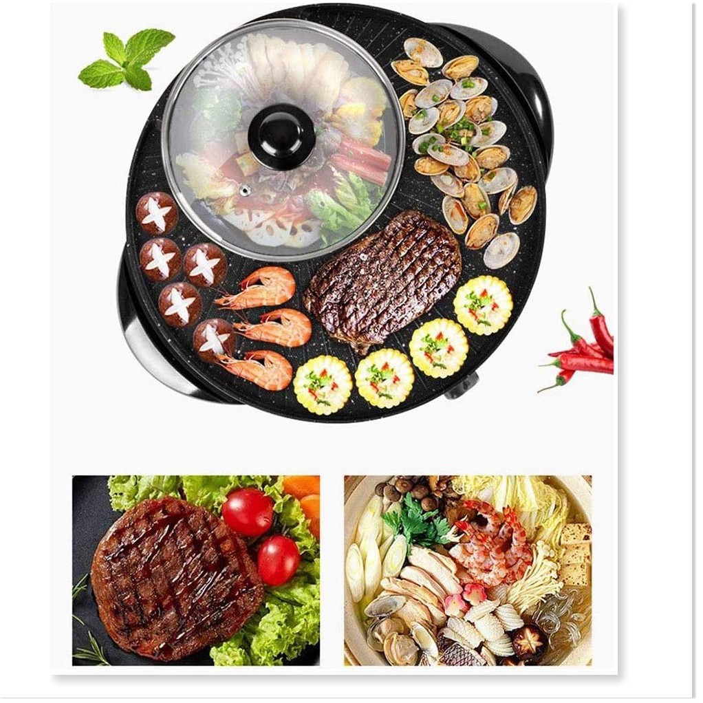 Sản phẩm kết hợp giữa nướng với lẩu điện tạo nên một sản phẩm vượt trội so với những sản phẩm cùng loạiMâm nướng có thiết kế đặc biệt và được tráng một lớp chống dính siêu bền, chống mài mòn, không làm dính thức ăn và an toàn đối cho người sử dụng.