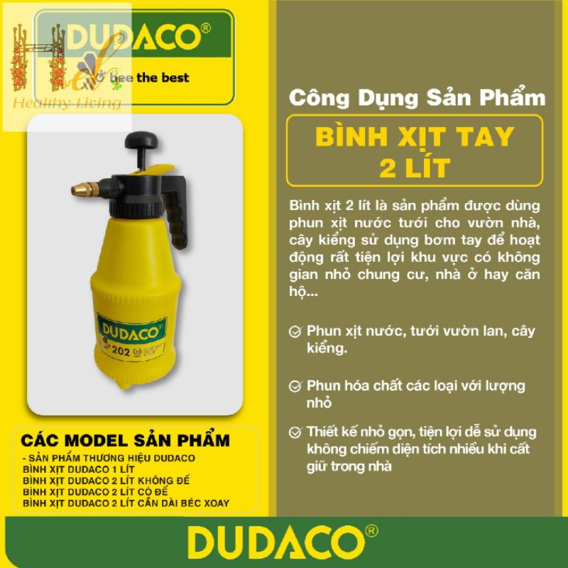 Bình DUDACO 2 lít loại không đế, béc đồng, dùng được với các loại hóa chất, nông dược thông thường.Xuất xứ : Việt Nam
