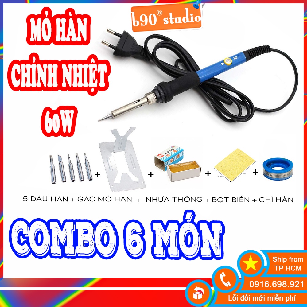 GIÁ SỈ Combo Máy Hàn Chỉnh Nhiệt 60w , 5 mũi hàn , nhựa thông , chì hàn , gác mỏ hàn , bọt biển