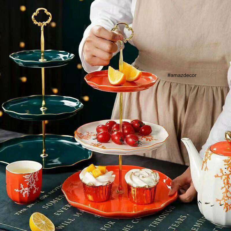 Giới thiệu [Giá sỉ đồ decor Tết 2021] Khay kệ đựng bánh kẹo mứt hoa quả Tết bằng sứ cam xanh cao cấp sanh chảnh R05