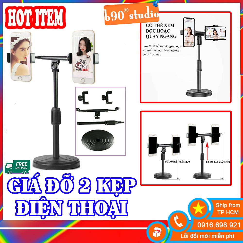Giá đỡ điện thoại để bàn, giá kẹp 2 điện thoại để bàn, dùng livestream chuyên nghiệp.Chất liệu hợp kim chắc chắn.