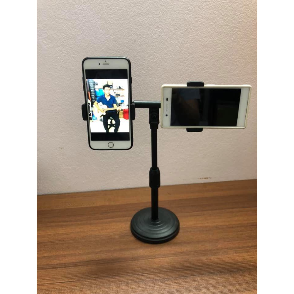 Giá đỡ kẹp 2 điện thoại dùng cho quay video, livestream... Chất liệu hợp kim chắc chắn. Phù hợp gắn các máy từ 4 – 6 inch, giá đỡ Live kéo dài đế tròn. Giá đỡ live chữ T có thể kéo dài ra được thiết kế với đế tròn gọn nhẹ nhưng khá chắc chắn thuận tiện cho việc di chuyển mà mang theo bên mình.