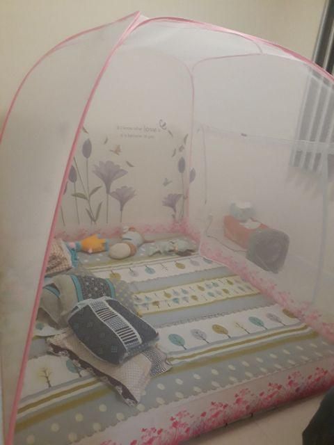 - KHÔNG GIAN SINH HOẠT CẢ BỐ VÀ MẸ: Để con nhỏ chơi trong màn chụp này, bố mẹ không phải lo lắng ngoài vấn đề MUỖI CẮN, mà còn giúp các bé bị té khỏi giường. Do Màn ôm sát nệm, có 4 dây chun cài rất chắn chắn