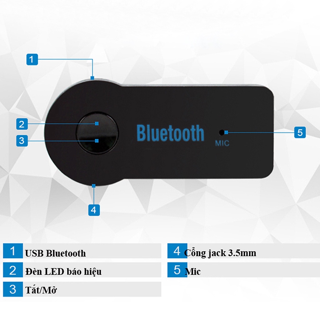 - Bộ sản phẩm gồm: 1 USB bluetooth, 1 trục jack 3.5mm và 1 cáp sạc