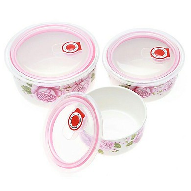 Đặc biệt mỗi tô đều có nắp đậy tiện dụng, kín, hút chân không tuyệt đối,có khả năng chịu nhiệt cao, dùng được cho lò vi sóng.Đường kính thố: 14.5cm - 12.5cm - 9.5cmDễ dàng vệ sinh sản phẩm: với bề mặt bát được tráng men láng mịn sáng bóng nên sẽ rất khó cho những vết bẩn hay dầu mỡ có thể bám lại được, chỉ cần sử dụng bông rửa nhẹ nhàng không cần kì cọ vất vả như nhiều sản phẩm thông thường khác.- Bộ 3 bát sứ có nắp hút chân không
