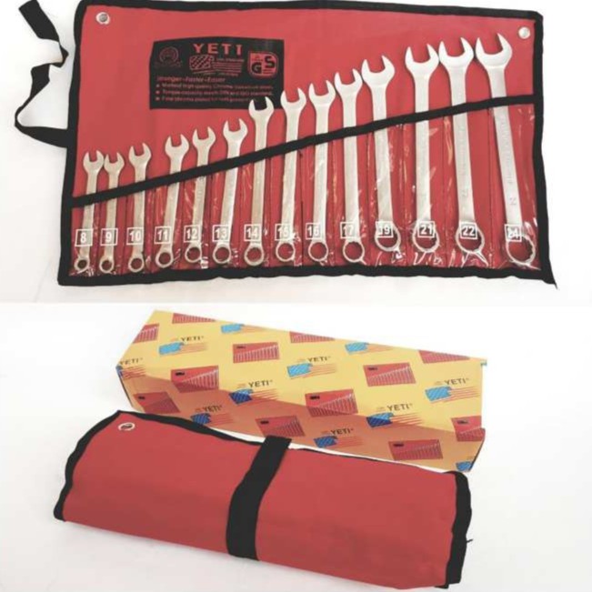BỘ CỜ LÊ YETI 14 CHI TIẾT 8-24mm Loại NEW- Bộ cờ lê 14 chi tiết Yeti gồm 14 chiếc cờ lê có một đầu hở và một đầu tròn với vòng miệng khác nhau như: 8, 9, 10, 11,12,13,14,15, 17, 18, 19, 21, 22, 24 rất đa dạng để bạn có thể sử dụng để sửa chữa nhiều máy móc khác nhau. Bộ cờ lê 14 chi tiết Yeti sẽ giúp bạn mau chóng hoàn thành công việc một cách tốt nhất mà không tốn quá nhiều thời gian