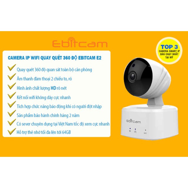 Cameras & Flycam > Camera giám sát > Camera giám sát kết nối internet || {Giá Sốc}Camera ip wifi không dây Ebitcam E2-1 MP(720P)Tăng khả năng lưu trữ gấp 5 lần camera thông thường BH 2 nămCòn hàng