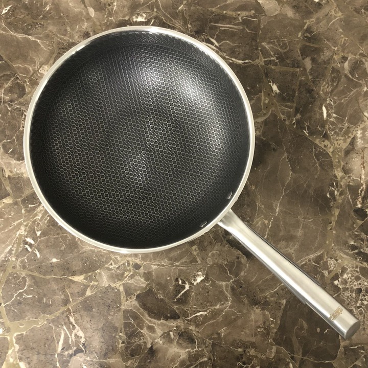 ✍ Chảo chống dính lòng sâu inox 304 cao cấp DSP CS004-W32 và CS004-W34 sử dụng công nghệ phủ không dính là khoan khắc bề mặt inox để làm trồi lên những trụ nhỏ xếp hình tổ ong, trụ inox trồi cao che chắn và bảo vệ những tác động từ các dụng cụ nấu ăn lên lớp không dính.