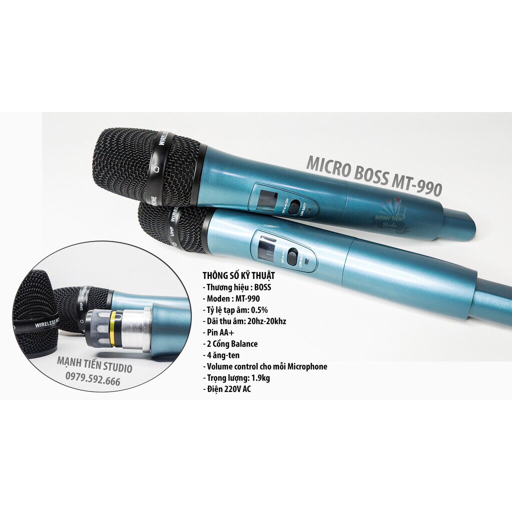 Thông thường mỗi đầu thu micro không dây nói chung chỉ trang bị 2 ăng-ten hỗ trợ cho việc thu phát sóng. Riêng micro Boss MT-990 được thiết kế với 4 ăng-ten nên mở rộng phạm vi thu phát sóng đến mức tối đa, có thể lên đến 100m nên đáp ứng được yêu cầu của những buổi trình trình ngoài trời trên sân khấu lớn, hội trường lớn và sử dụng tốt ở những không gian nhỏ như tiệc cưới, tiệc sinh nhật, quán karaoke, cafe hát cho nhau, karaoke gia đình...