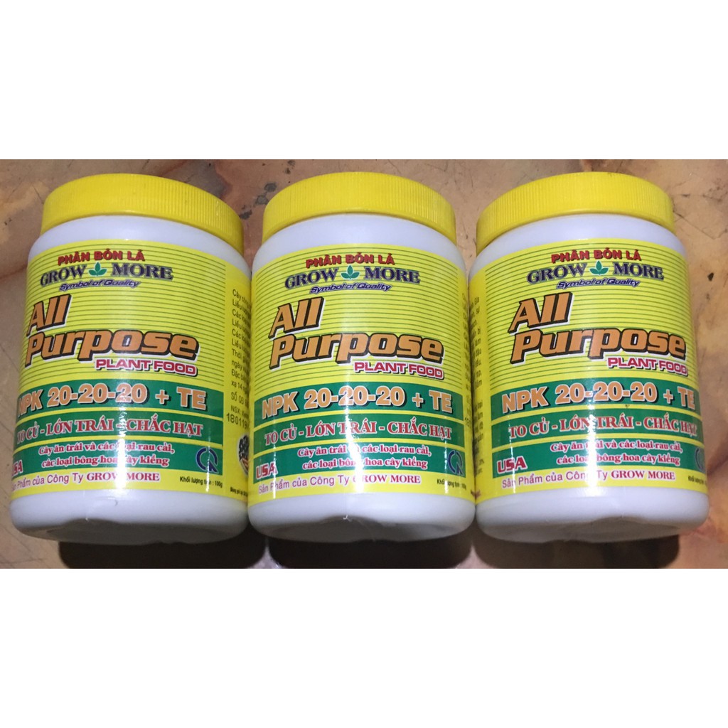 Phân bón lá cao cấp NPK Growmore 20-20-20 hộp 100gGrowmore 20-20-20 thành phần gồm N: 20%, P2O5 20%, K2O 20%, các nguyên tố vi lượng: Cu, Zn, Mn,...