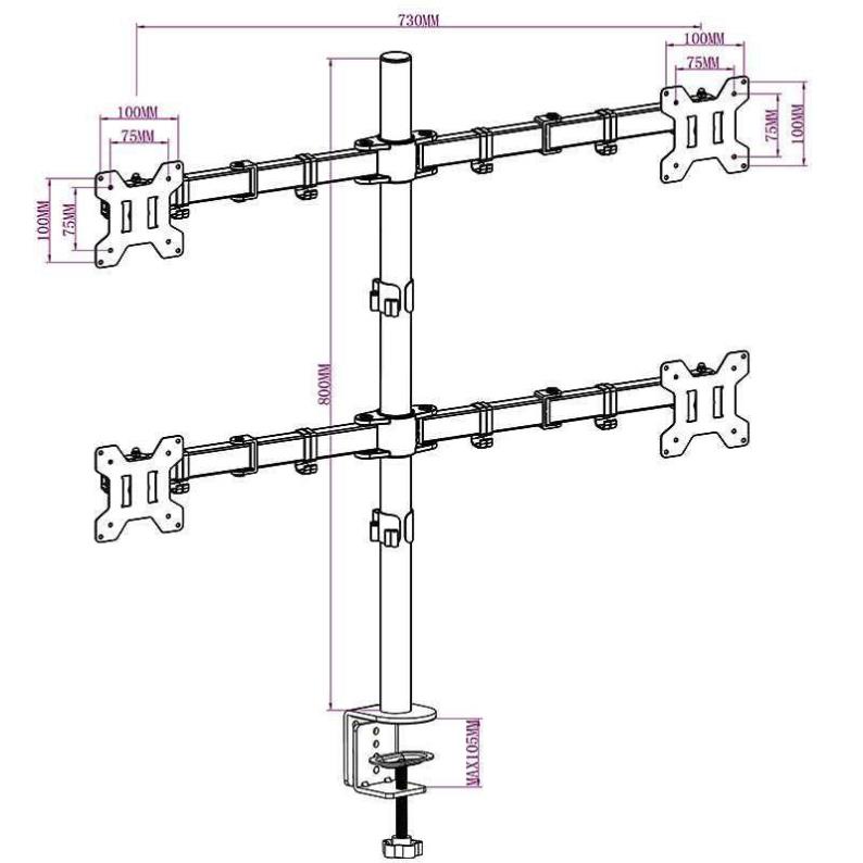 Thiết kế chân đế kẹp vào mép bàn giúp sản phẩm có thể đứng vững chắc không bị rung lắc khi sử dụng. Chiếc Giá đỡ 4 màn hình để bàn này có 4 cánh tay, ở mỗi cánh có các khớp giúp sản phẩm hoạt động linh hoạt hơn. Chiều dài mỗi cánh tay là 35cm