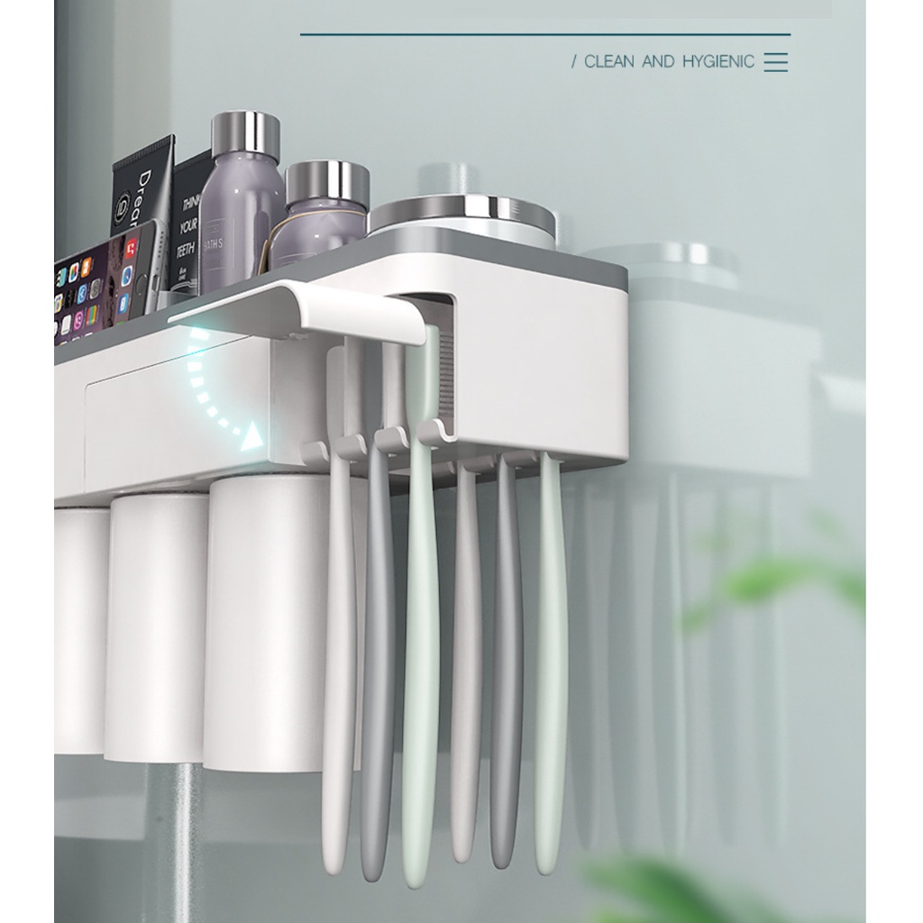 • Nhiều công dụng: khe đỡ điện thoại, ngăn đựng kem đánh răng, mỹ phẩm, ngăn kéo nhỏ, 6 khe treo bàn chải đánh răng, 3 ly súc miệng đay nam châm