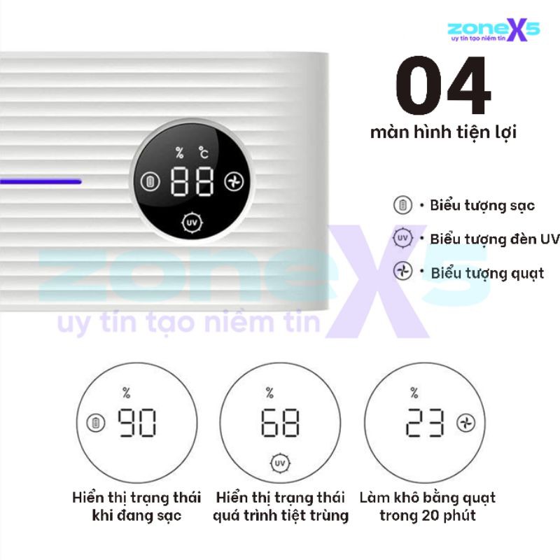 - Làm khô bằng gió nóng - sử dụng sợi carbon để làm nóng và làm khô bằng gió ấm đồng đều và liên tục, nhẹ nhàng không làm tổn thương tới bàn chải. Ngăn chặn sự sinh sôi của vi khuẩn.