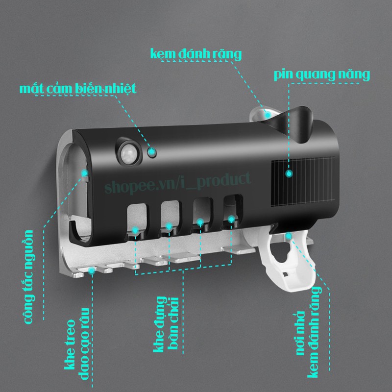 - Giá treo bàn chải có trang bị mắt cảm biến nhiệt, khi người tới gần giá treo, giá treo sẽ tự động tắt tia UV tránh gây hại tới người sử dụng. Tuyệt đối an toàn cho người dùng