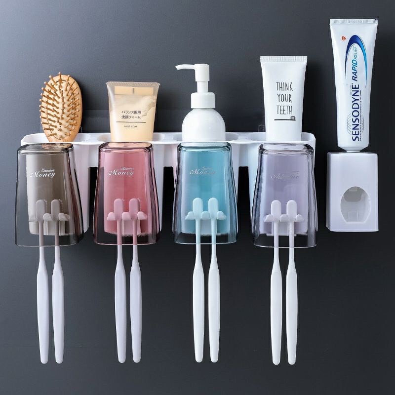 Giá treo bàn chảy đánh răng dán tường đủ bộ 4 cốc cao cấp kèm dụng cụ nhả kem đánh răng