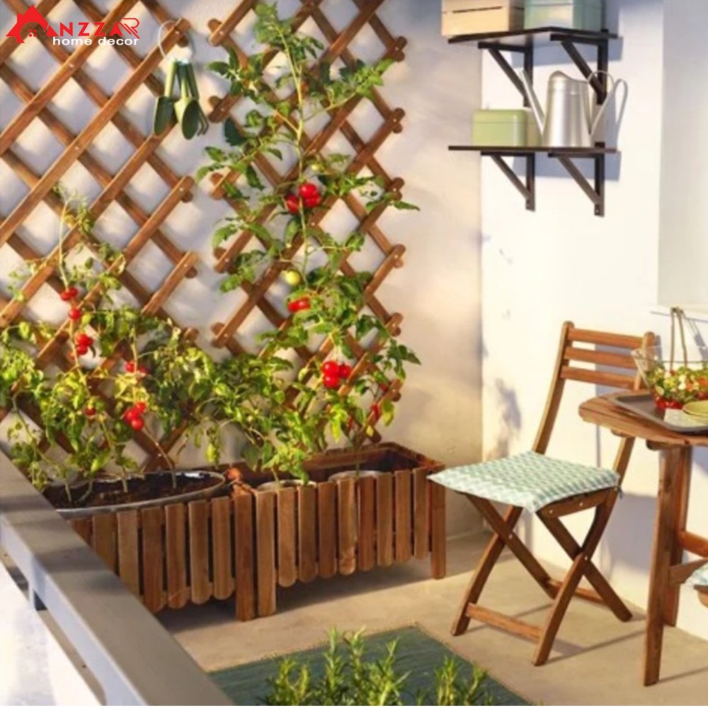 - Chất liệu: Giàn gỗ treo cây ban công được làm từ gỗ thông được xử lý chống mối mọt, ẩm mốc