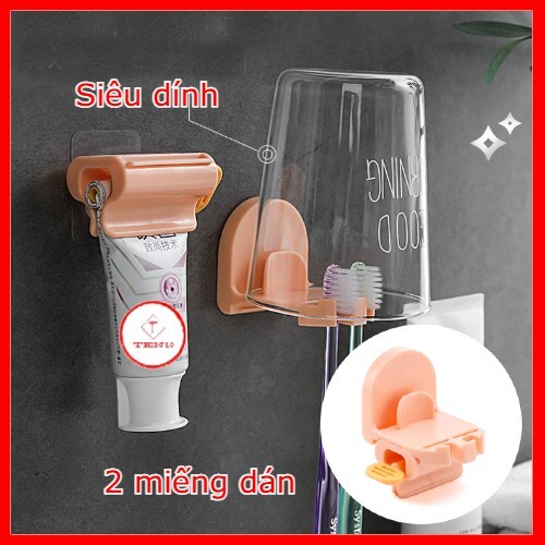 Giá treo để bàn chải đánh răng kèm Nặn kem đánh răng xoay dán tường siêu dính tiện lợi, có thể lắp ghép màu xanh hồng