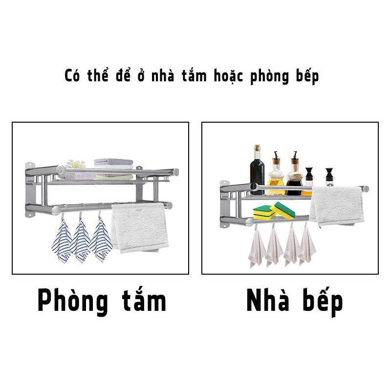 - Giá gồm nhiều thanh ngang được kết cấu hợp lý & cực kỳ chắc chắn, bạn có thể để quần áo, phụ kiện tắm trên kệ & treo vắt khăn bên dưới thật gọn gàng & tiện lợi khi sử dụng.