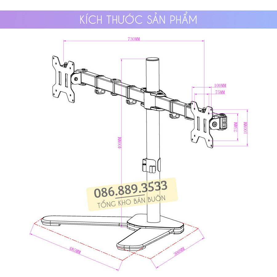 Thông số kỹ thuật sản phẩm giá treo hai màn hình, chân để 2 màn hình:
