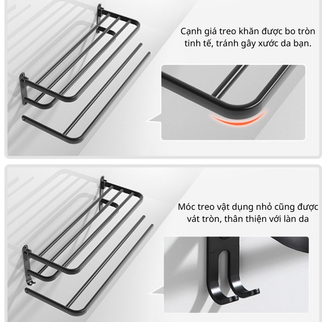 - Giá treo khăn giúp bạn sắp xếp quần áo và khăn tắm ngăn nắp luôn khô ráo sạch sẽ tránh ẩm ướt nấm mốc.