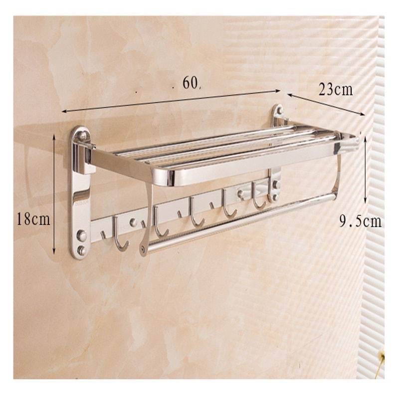 Kệ treo khăn thiết kế đa năng, tầng trên để đặt khăn tắm khi xếp thành cuộn; có 1 thanh ngang để vắt khăn tắm cho khô; bên dưới thiết kế thanh móc treo đồ với 5 móc trụ đặc. 5 móc trụ đặc uốn cong lên để giữ quần áo móc vào dễ dàng mà không tuột rơi xuống, phần đỉnh móc được mài nhẵn trơn tru, nên không gây ra rách quần áo khi móc lên.