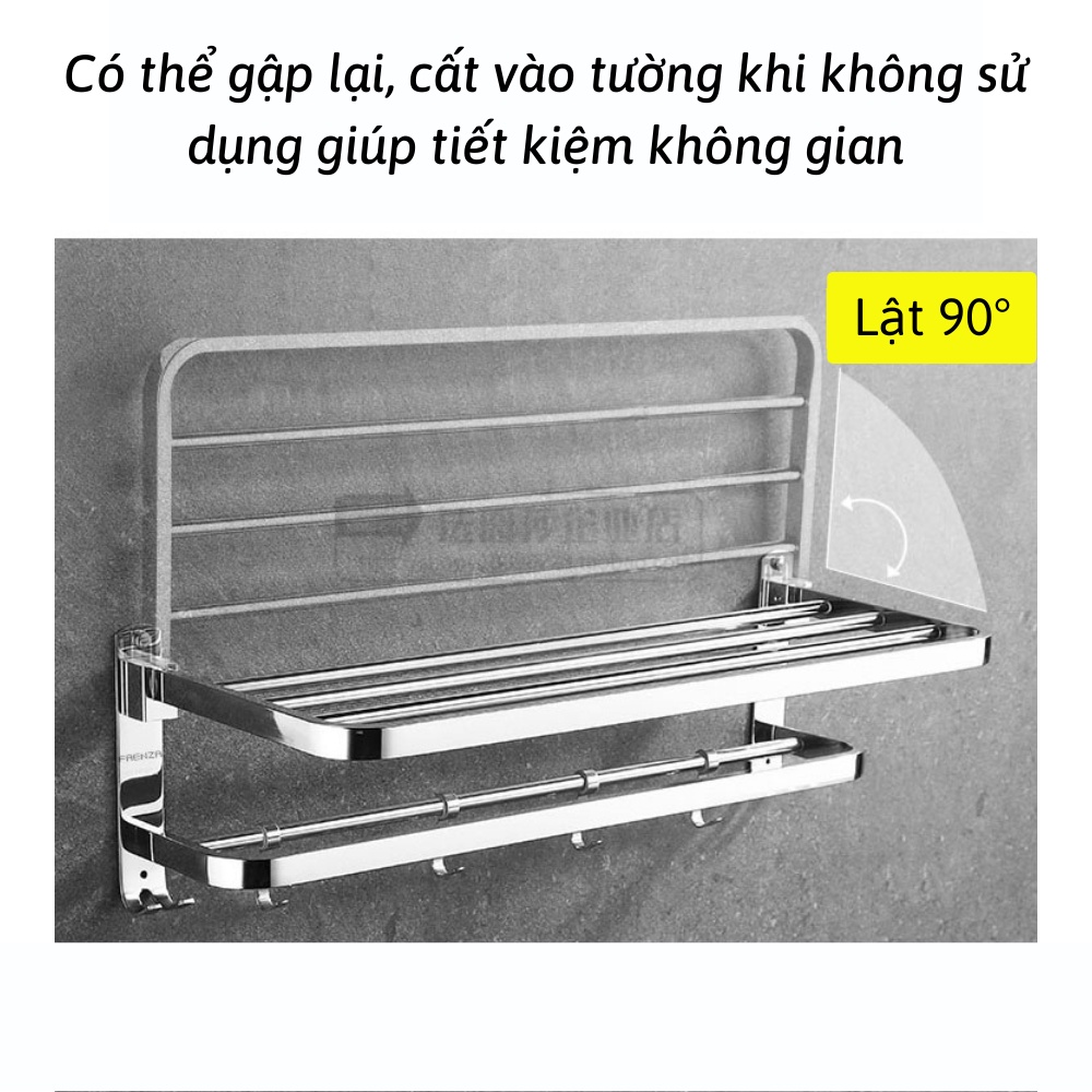 Kệ treo khăn thiết kế đa năng, tầng trên để đặt khăn tắm khi xếp thành cuộn; có 1 thanh ngang để vắt khăn tắm cho khô; bên dưới thiết kế thanh móc treo đồ với 5 móc trụ đặc. 5 móc trụ đặc uốn cong lên để giữ quần áo móc vào dễ dàng mà không tuột rơi xuống, phần đỉnh móc được mài nhẵn trơn tru, nên không gây ra rách quần áo khi móc lên.Khung viền là khung inox với bản rộng 20mm, dày 8mm vô cùng chắc chắn và đánh bóng sáng, đẹp. Khung viền bao quanh 3 ống trụ tròn tạo thành tầng trên cùng. Khung viền được thiết kế gắn với bản giá đỡ bằng 2 bản lề, nên giúp khung viền tầng trên cùng có thể gập lên thẳng đứng hoặc gập nghiêng tạo góc 90 độ so với phương thẳng đứng của tường.