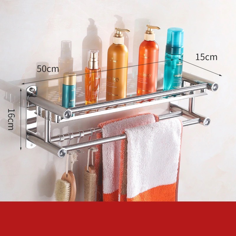 - Giá gồm nhiều thanh ngang được kết cấu hợp lý & cực kỳ chắc chắn, bạn có thể để quần áo, phụ kiện tắm trên kệ & treo vắt khăn bên dưới thật gọn gàng & tiện lợi khi sử dụng.